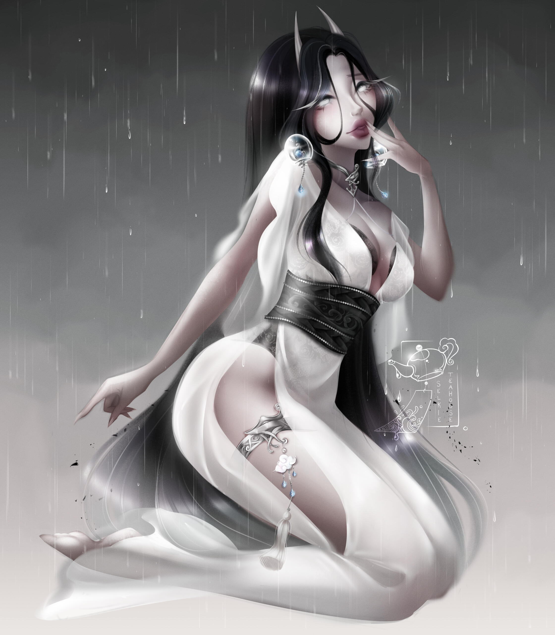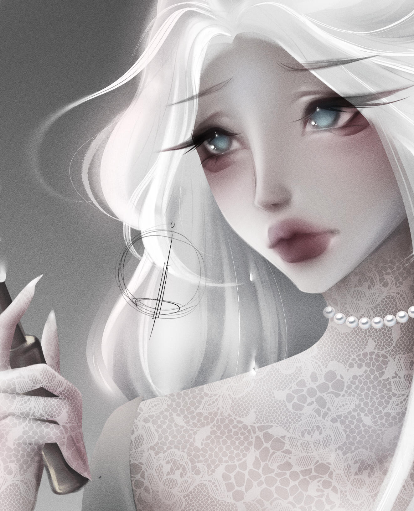 illustration work commission work, featuring character design ❛ rain tea ❜ designed by myself for client. design features smoke & misty elements, with pearls; dark laced mesh; silver chain and jewelry; fur coat of white.
