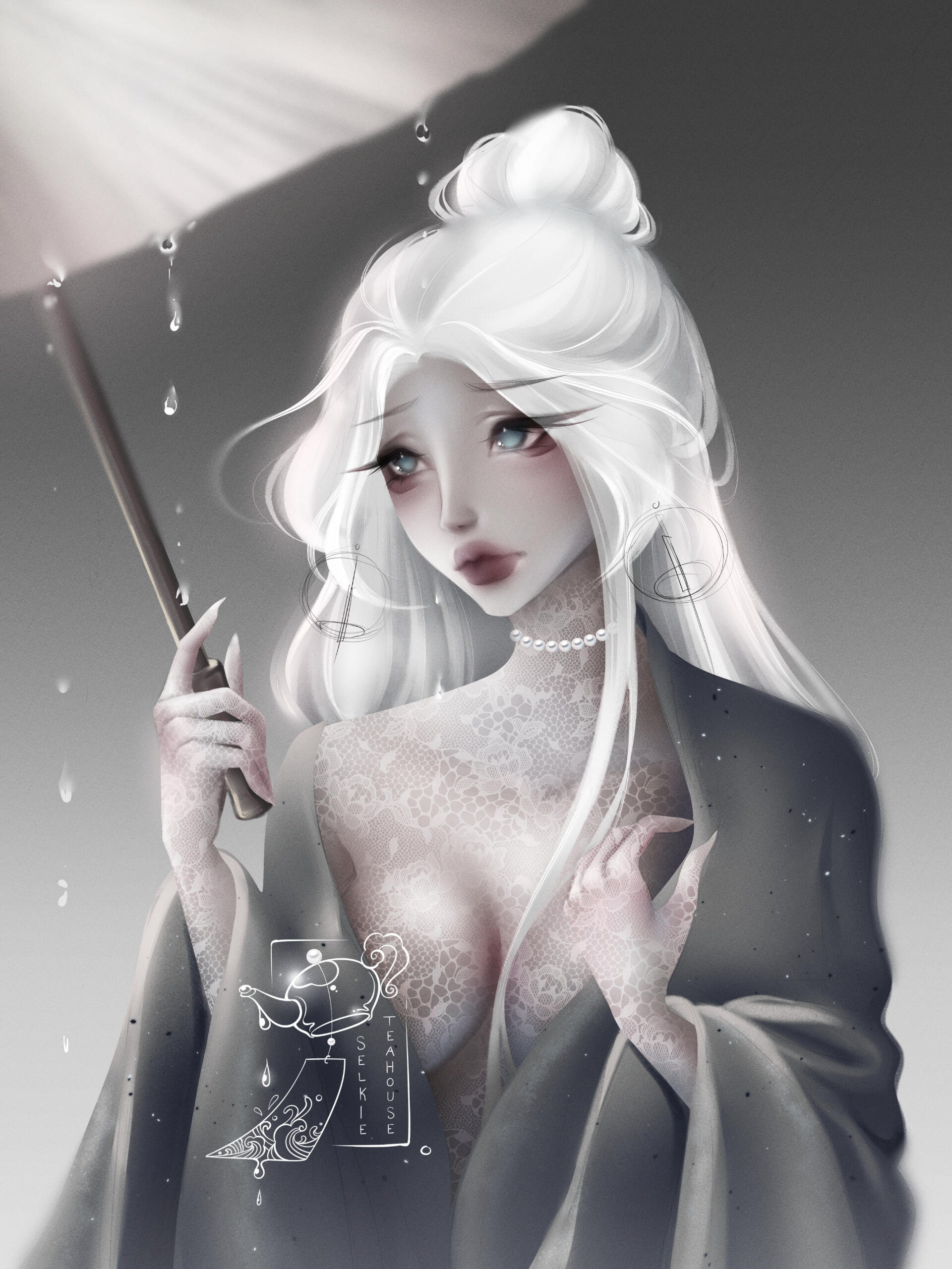 an illustration featuring a personal character design, with long silken white hair and her coat of seal skin, adorned in lace and pearls, she holds a paper parasol as rain drops slip by. her expression one of slight sorrow, and contemplation. her windchime earrings however, are unfinished.